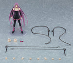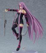 Rider returns with an updated sculpt and design. The smooth yet poseable flexible plastic of figma allows for proportions to be kept without compromising posability on the included articulated figma stand. She comes with 3 face plates: an expressionless face, a face with gritted teeth, and a smiling face. Her mask that conceals her mystic eyes can be removed to reveal a different side of Rider. In addition, her dagger weapons are included in both chain versions, while the PVC versions were sculpted to look as though in motion.