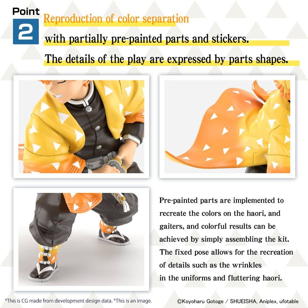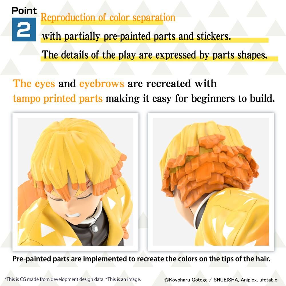Zenitsu Agatsuma joins the Demon Slayer Model Kit series as a model with a focus on design and color expressions! Tampo printed and pre-painted parts allow both each assembly and high quality at the same time. Order your model kit today and add to your Demon Slayer: Kimetsu no Yaiba collection!