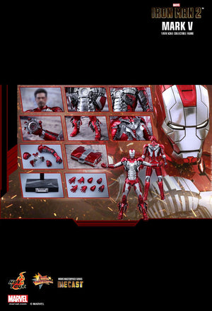 Hot Toys is pleased to reissue the Iron Man Mark V Sixth Scale Collectible Figure for fans who had missed its first release! Inspired by the signature appearance of Iron Man Mark V in Iron Man 2, the truly detailed "Suitcase Armor" figure in diecast has articulated armor pieces and highly poseable structure to recreate the fancy scenes.