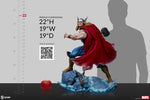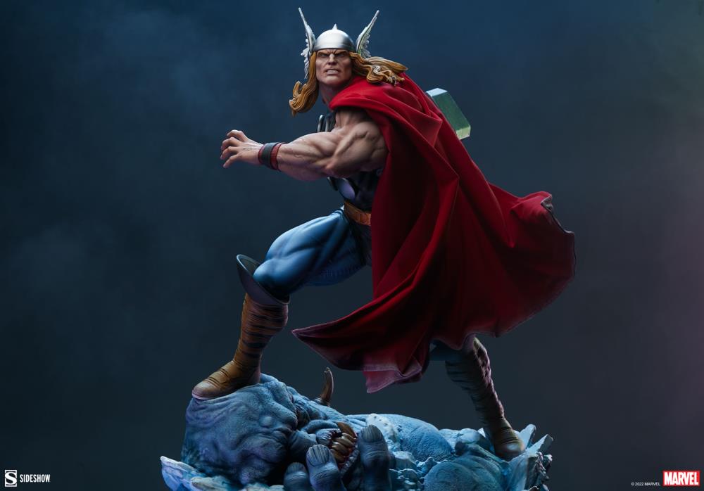 Verily, the Thor Premium Format Figure measures 22” tall and 19” wide as the son of Odin stands victorious atop a felled Frost Giant foe. The icy expanse of Jotunheim is no match for an Asgardian, and Thor swings his mystical mallet Mjolnir in anticipation of yet another glorious battle. The hammer is etched with its iconic enchantment, proving the prince worthy of its incredible power.