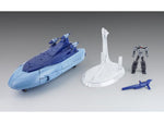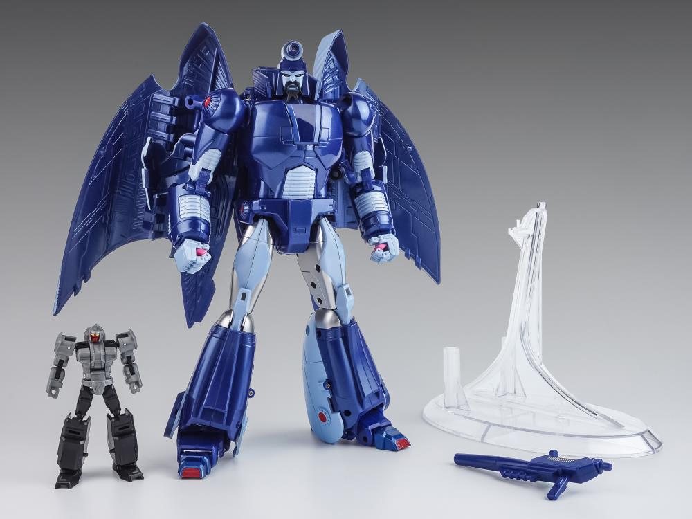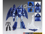 He stands about 9 inches tall in robot mode and converts into a space ship with ratchet joints for easy articulation and LED light-up functions in the headlights, along with the eyes in robot mode. He also features metallic parts, an opening and closing chest to house objects, and a secret chamber in the abdomen. Andras comes with a Rimfire mini figure, laser gun, a clear figure stand, and a bio card to learn more about him.