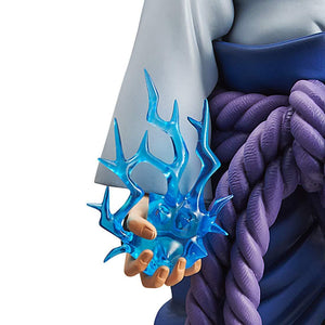From Banpresto. Naruto's best pal Sasuke brings his intense charm to Banpresto's collection of highly detailed non-articulated figures! Standing 10 5/8" tall, the figurine features Sasuke Uchiha in a relaxed pose with a smug look on his face and dressed in his Part II appearance with a white shirt open to the waist and a thick purple rope belt around his hips.