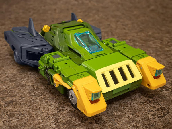 This updated version of PS-12 Saltus stands 9.25 inches tall in robot mode and is armed with a pistol blaster and sword. Saltus contains over 40 points of articulation and features real rubber tires and die-cast thighs and feet.