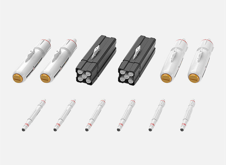 Presenting 1/20th scale armaments for the enormous PLAMAX MF-25: minimum factory VF-1 Super/Strike Gerwalk Valkyrie and PLAMAX MF-37: minimum factory VF-1 Super/Strike Fighter Valkyrie plastic model kits. 2 micro-missile pods, 4 reaction missiles, 2 sets of 3 air-to-air missiles and pylons to attach each armament to the VF-1 are included