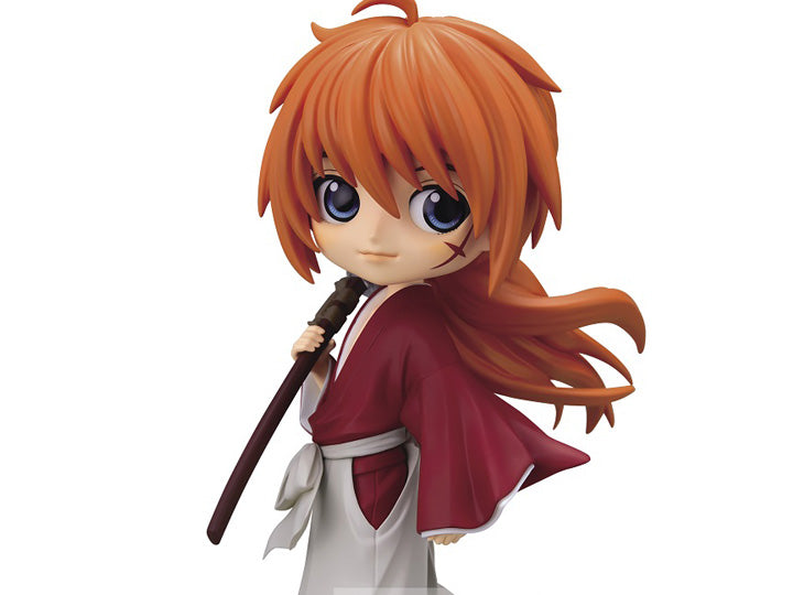 From the Rurouni Kenshin: Meiji Swordsman Romantic Story anime, the Q Posket figure of Kenshin Himura stands over 5 inches tall as he holds his Sakabato (reverse-blade sword) sheathed in one hand and looks over his shoulder with a calm smile. He wears his usual kimono, white umanori hakama, zori, and tabi. His big violet eyes, long thick ponytail, and cross-shaped legendary scars have been perfectly painted.