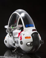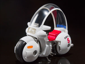 From the first episode of "Dragon Ball", the bike Bulma was riding has appeared in S.H.Figuarts! The roof panel and turn signal, head・tale lamp are molded in translucent plastic. The frame, front fork, muffler, and footrests are all made of diecast metal, giving the bike a satisfying sense of weight. It even comes with a display stand featuring the Capsule Corp. logo. It also includes an in-scale Goku. Plus, the stand lets you pose the bike statically, as if riding, or popping a wheelie!
