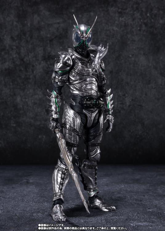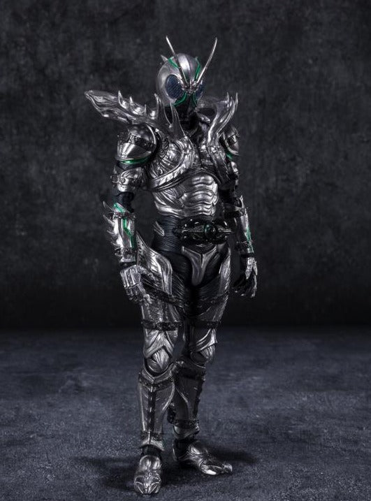 The figure employs joint parts similar to those of Kamen Rider Black Sun, so besides being able to fold and bend the elbows and knees, action poses can be achieved by twisting them too. The head and chest armor, whose design differs from that of Black Sun, are expressed via new modeling, and the full body coloring is expressed in a silver tint that differs from the armor parts. Weapons and hand replacement parts for gripping them are included as accessories, so you can reproduce actions with the weapons held. Order yours today!
