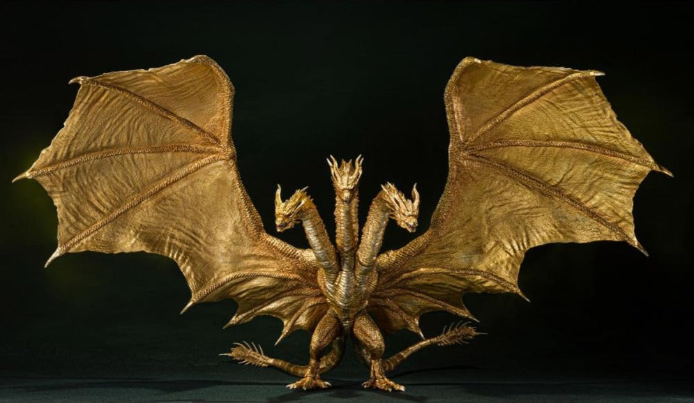 The fearsome King Ghidorah, as seen in the 2019 film Godzilla: King of the Monsters joins the S.H.MonsterArts series! It's sculpted and finished with all of the care you've come to expect from Bandai, featuring effect parts that let you replicate dramatic scenes from the film. Based on the same 3D data used in the film, and overseen by the legendary sculptor Shinichi Wakasa, it features accurate proportions, details, and coloration. This release features a new metallic gold color scheme.