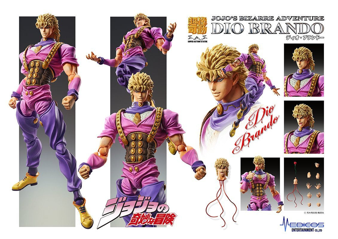 Super Action Dio Brando from "Part I: Phantom Blood" is back! Dio is the ultimate recurring, fan-favorite villain out to sever the Joestar family line. Medicos' Dio Brando Super Action Statue features the vampire in his younger years -- when he still had his own body -- and includes two different heads, several option hand parts, a long-stemmed rose, and a neck part to simulate the headless Dio just before taking over Jonathan's body.