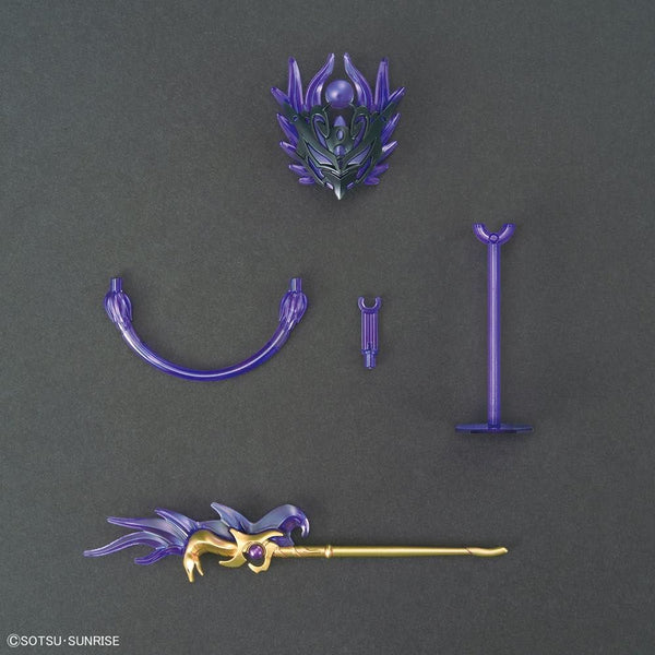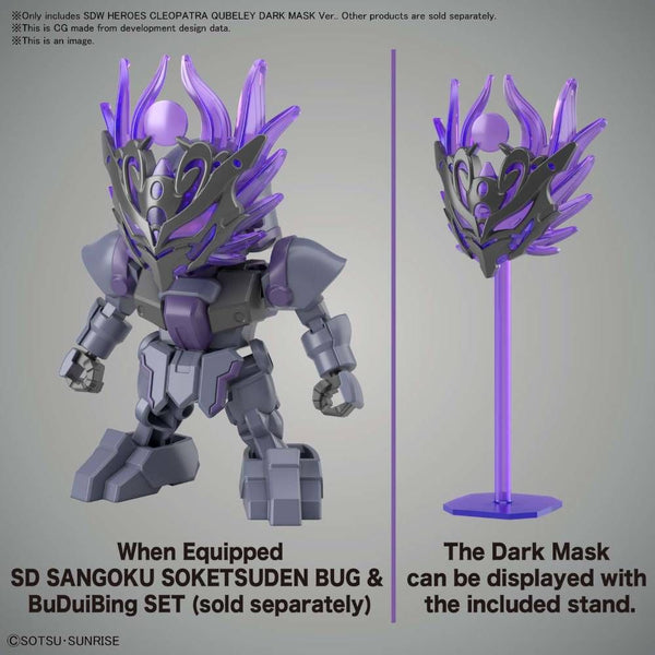 From Gundam's newest anime film, SD Gundam World Heroes comes a model kit featuring the Dark Mask version of Cleopatra Qubeley! This model kit includes a stand for the removable Dark Mask, including a weapon accessory.