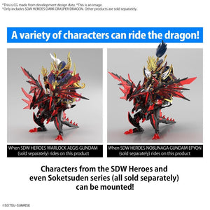 The Dark Grasper Dragon from "SD Gundam World Heroes" gets a new model kit from Bandai! After the bike and the horse, it's the dragon! New item for a wide range of characters to ride! Once completed, the figure features more than 12 points of articulation. Characters from the SDW Heroes series as well as the SD Sangoku Soketsuden series can ride the figure!