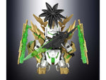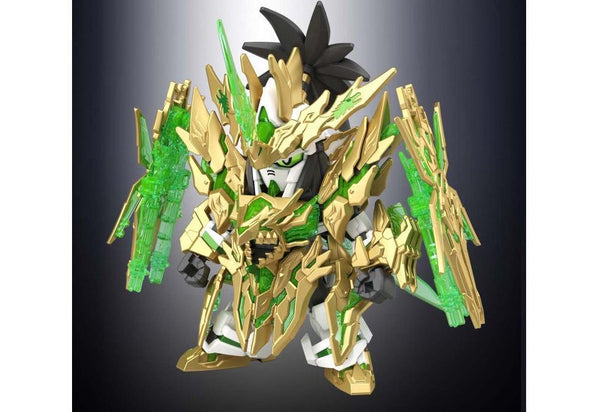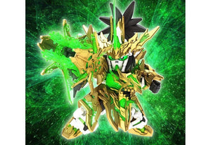 The awakened form of Liu Bei Unicorn Gundam is here, featuring updated coloring and armor! This model can be converted between sword and gun forms, as well as attached to back. Other weapon components from SD Sangoku Soketsuden kits can combine with Liu Bei!