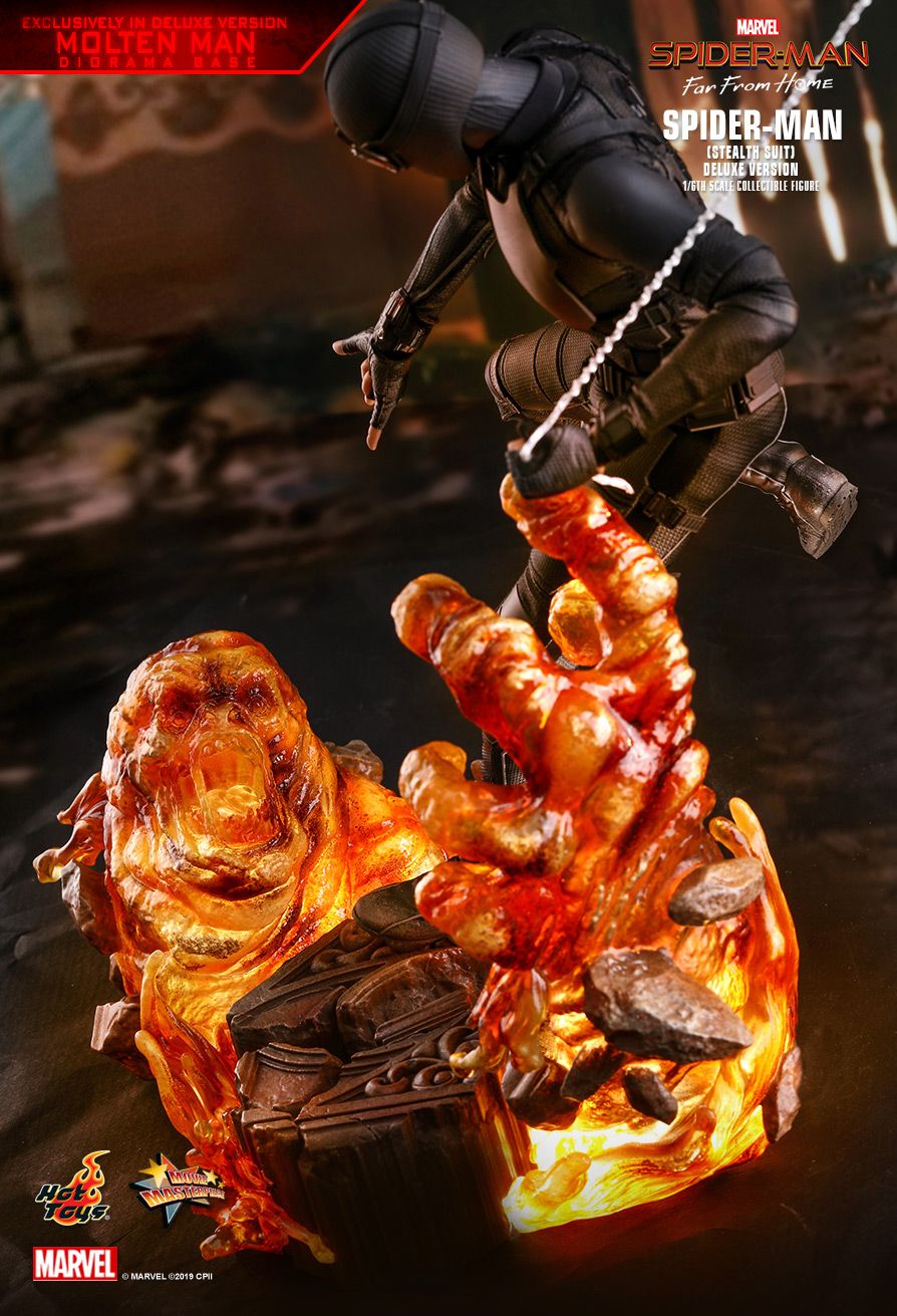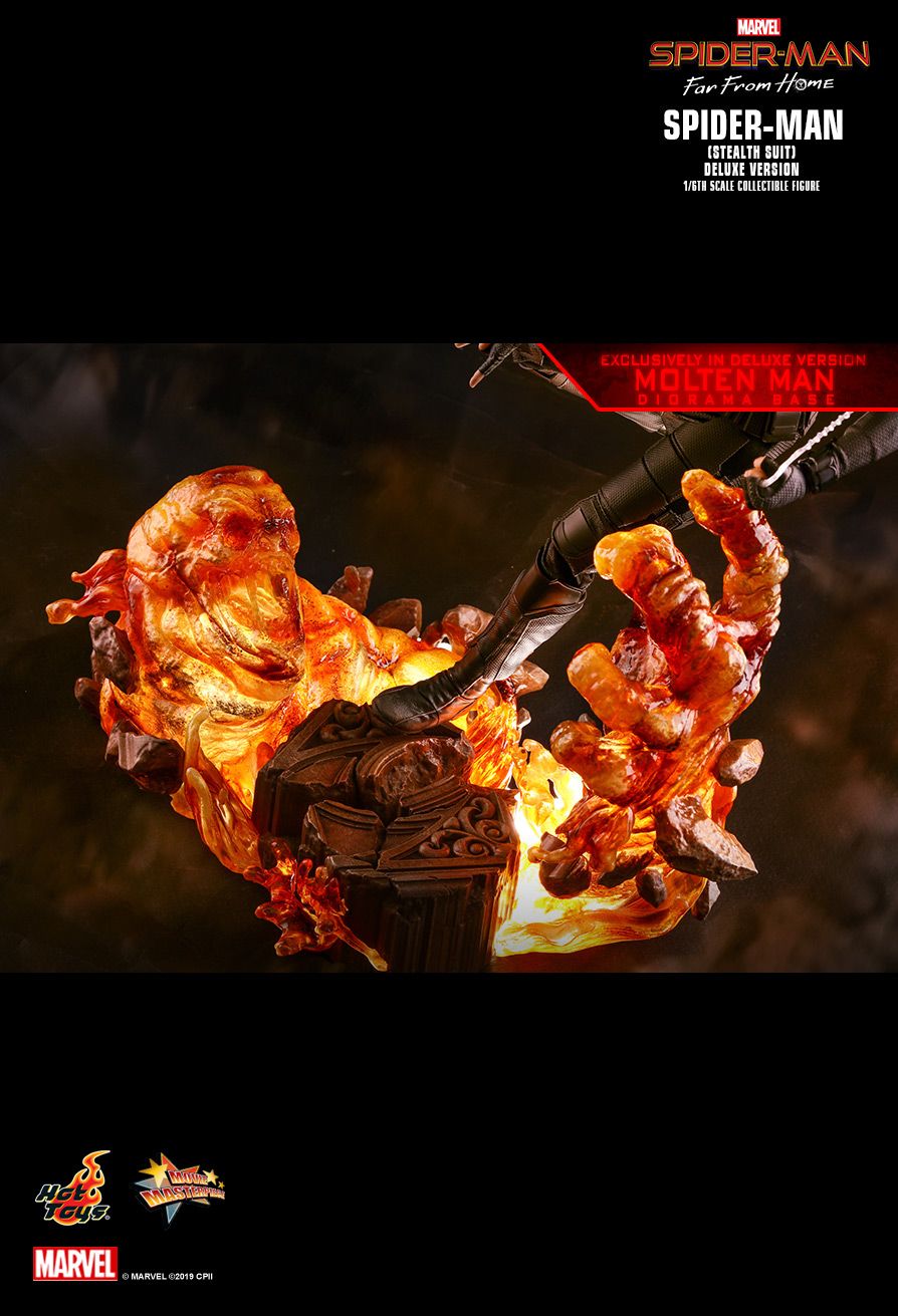 Hot Toys is pleased to have the first diorama figure base beautifully designed by Studio HIVE for the Deluxe Version. Inspired by the battle scenes against Molten Man, this elaborated diorama figure base features 2 LED light up modes is absolutely a must-have for fans of Spider-Man.