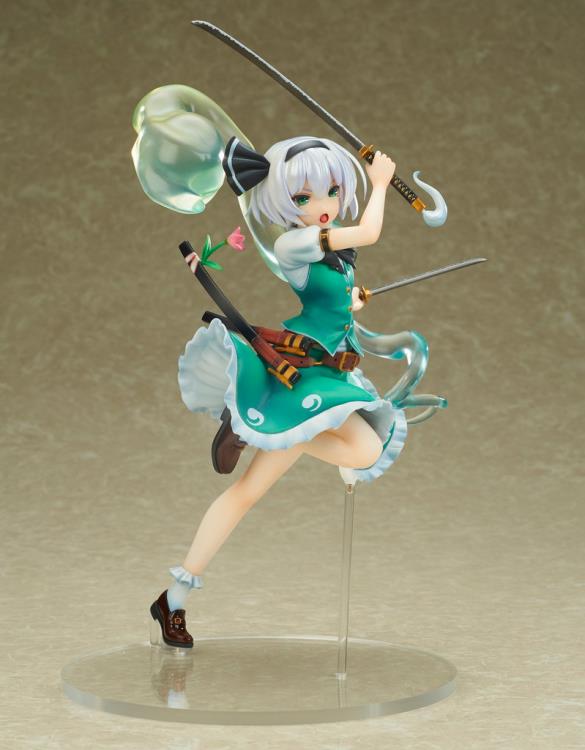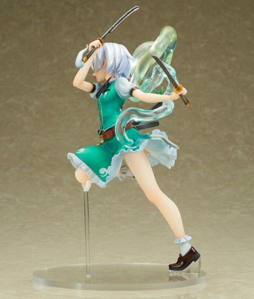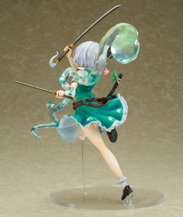 From the video game, Touhou Project comes the half-human half-phantom, Youmu Konpaku. Standing about 8 inches tall, Youmu has her swords drawn and features translucent phantom parts.