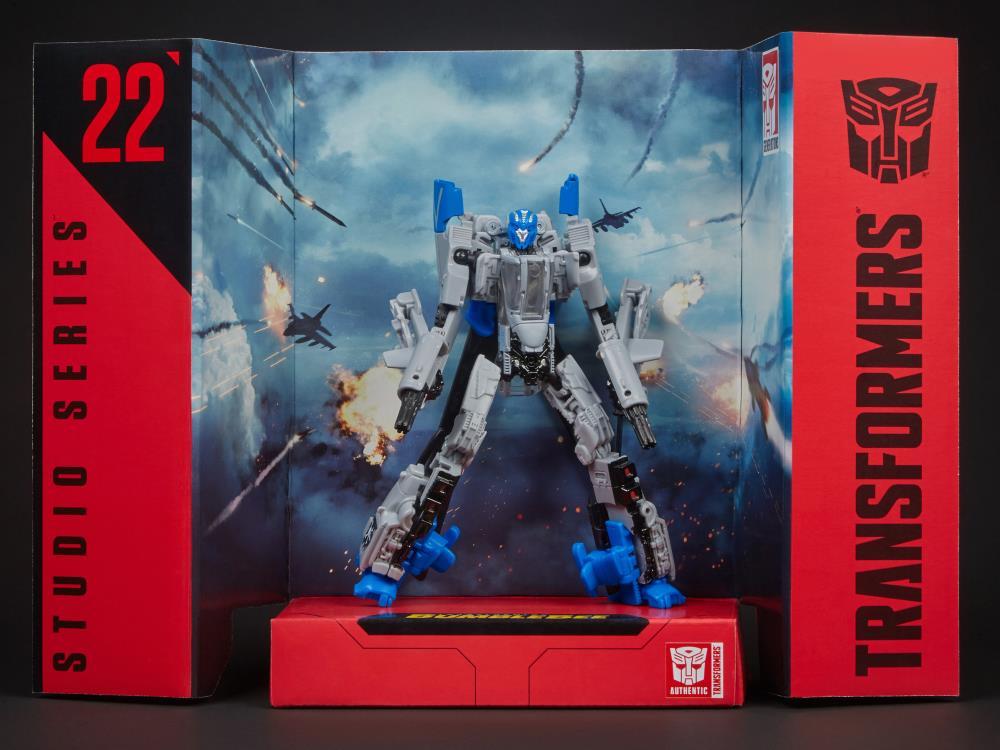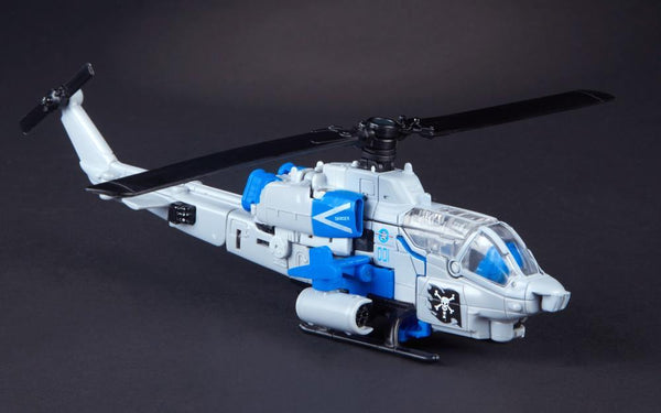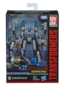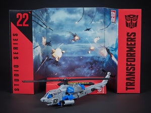 This Studio Series 22 Deluxe Class Dropkick figure converts from robot to Bell Helicopter mode in 24 steps and comes with 2 accessories. Remove the backdrop to showcase Dropkick in the Autobot pursuit scene!