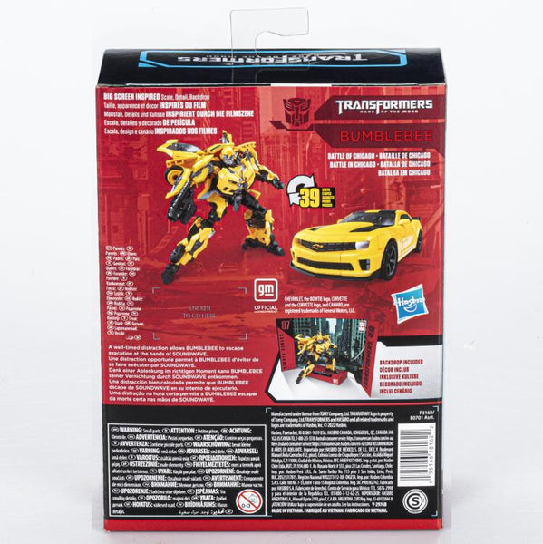 This Studio Series 87 Deluxe Class Transformers: Dark of the Moon -inspired Bumblebee figure converts from robot to licensed Camaro mode in 39 steps. Remove backdrop to showcase Bumblebee in the Battle of Chicago scene. In the Battle of Chicago scene from Transformers: Dark of the Moon, a well-timed distraction allows Bumblebee to escape execution at the hands of Soundwave. Pose the figure out with the included blaster accessory and imagine re-creating this classic movie moment!