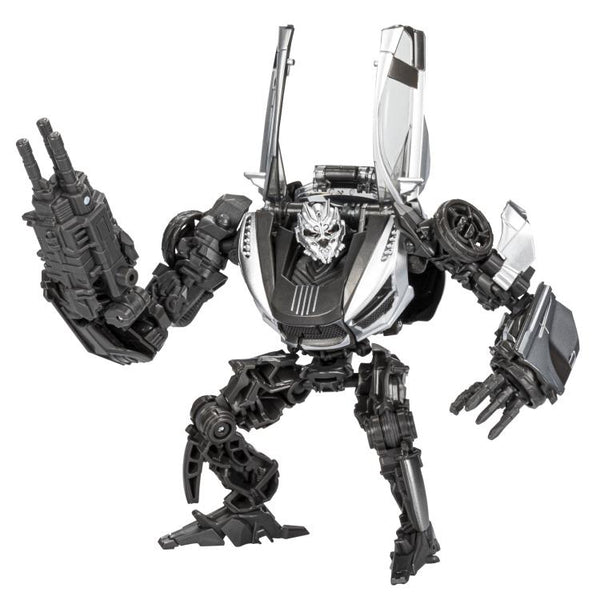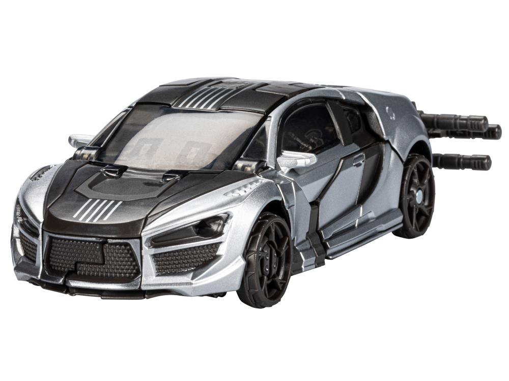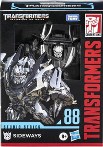 This Studio Series 88 Deluxe Class Transformers: Revenge of the Fallen-inspired Sideways figure converts from robot to sports car mode in 20 steps. Remove backdrop to showcase Sideways in the Shanghai Pursuit scene. In the Shanghai Pursuit scene from Transformers: Revenge of the Fallen, Sideways attempts a speedy escape through the Shanghai streets before being sliced in half by Sideswipe. Pose the figure out with the included blaster accessory and imagine re-creating this classic movie moment!